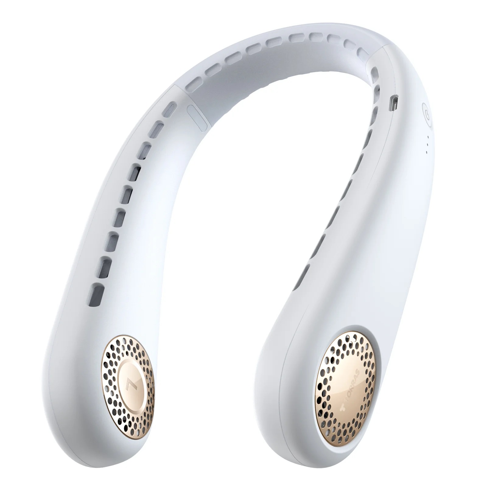 Portable hands-free neck fan for instant cooling anywhere.